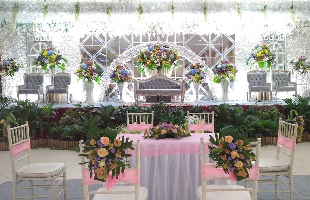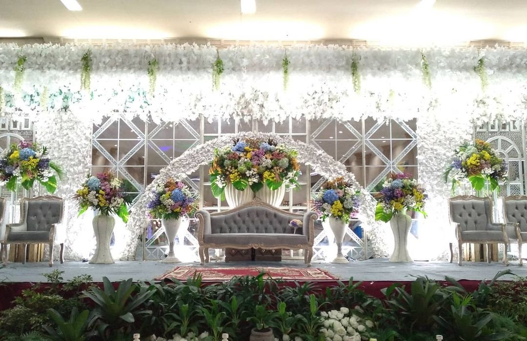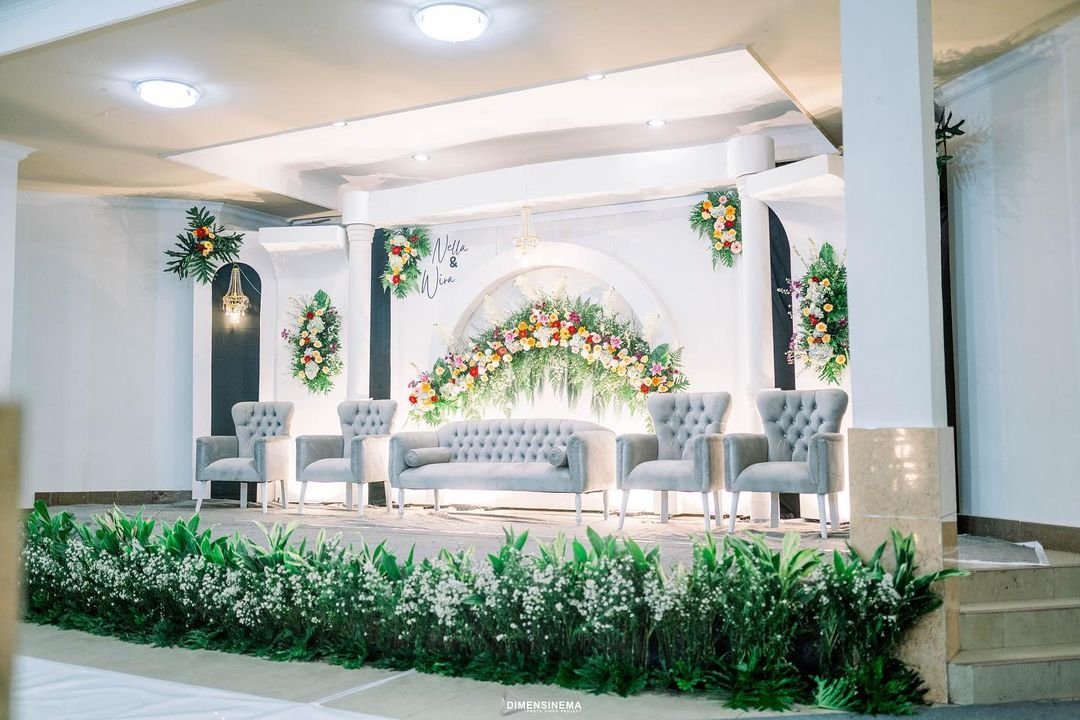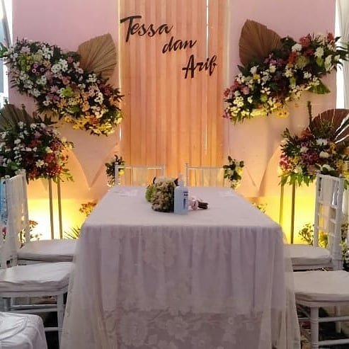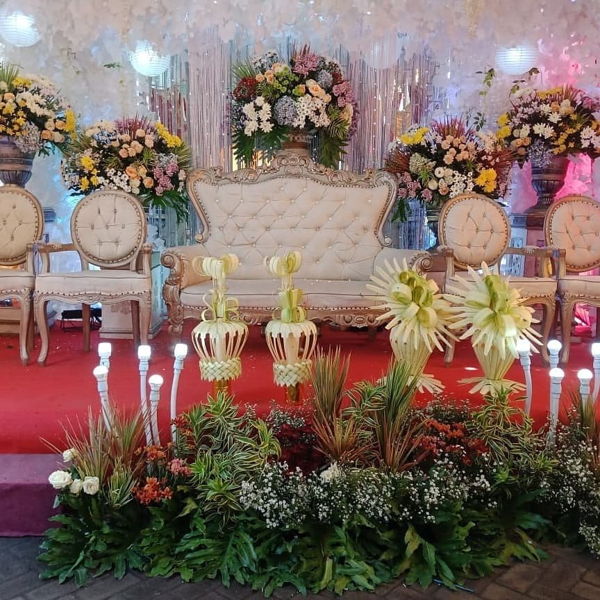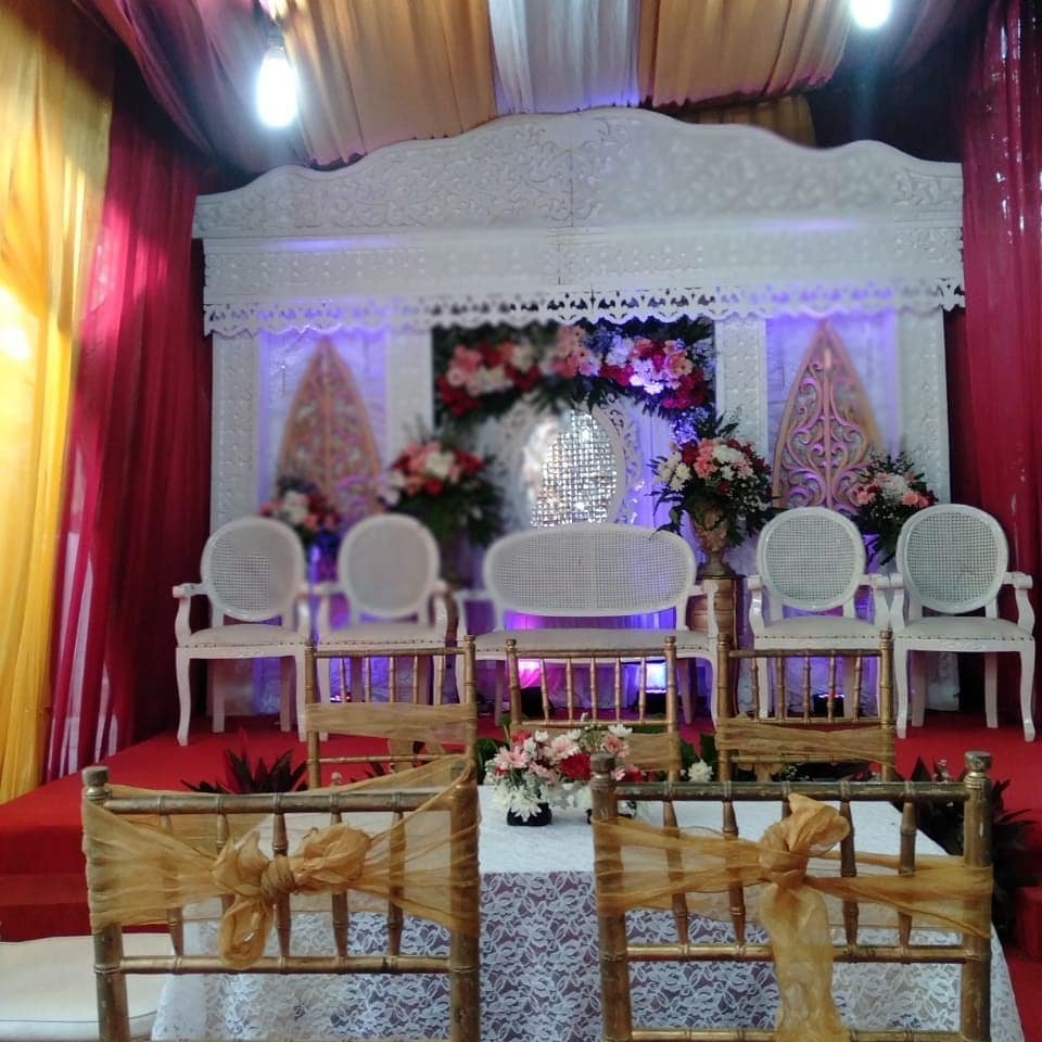 Dekor pelaminan 6m, Mini garden, Meja akadd, Standing dlower 4buah, Standing flower meja 1, Standing flower pelaminan 2, kursi 100, peralatan prasmanan, janurm sound system |